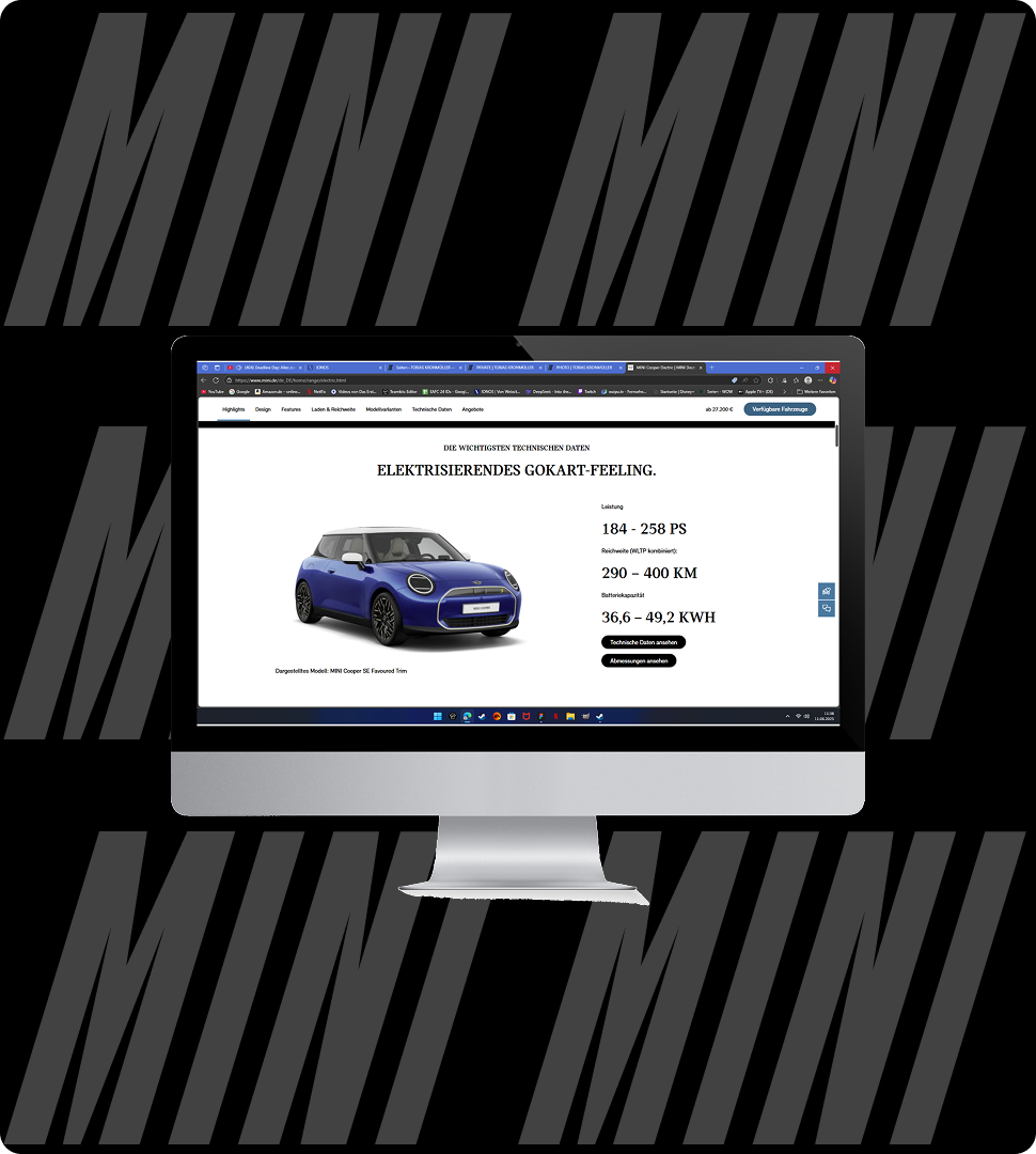 My job: Imagery that fits as precisely as a MINI in a parking spot. I hunted stock photos through forensic filters, trimmed lifestyle shots to pixel-perfection, and crafted custom visuals – from header graphics to cookie banners that don’t sting. Translation: I made the website feel like a MINI drives: quick, alive, unapologetic.
